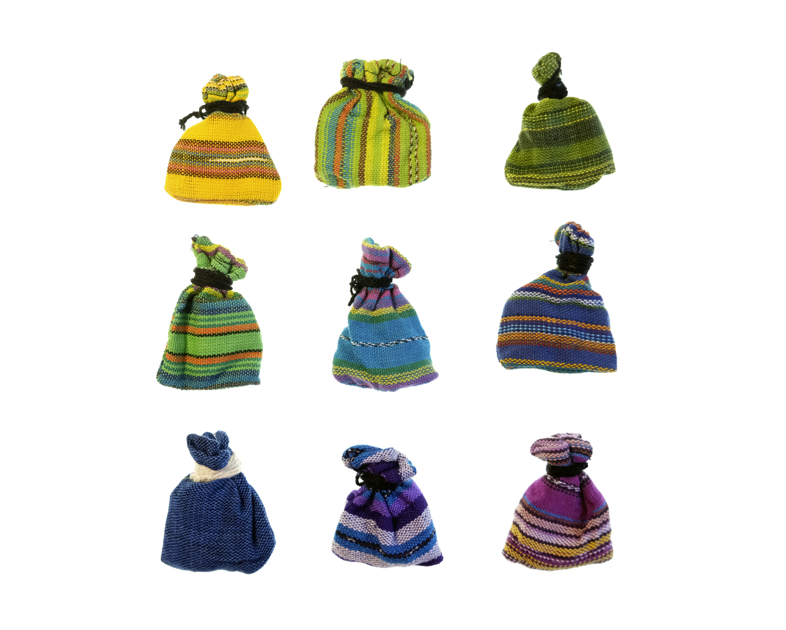 Los saquitos también están cosidos a mano, confeccionados con diferentes telas típicas. Son muy coloridos y vistosos.
